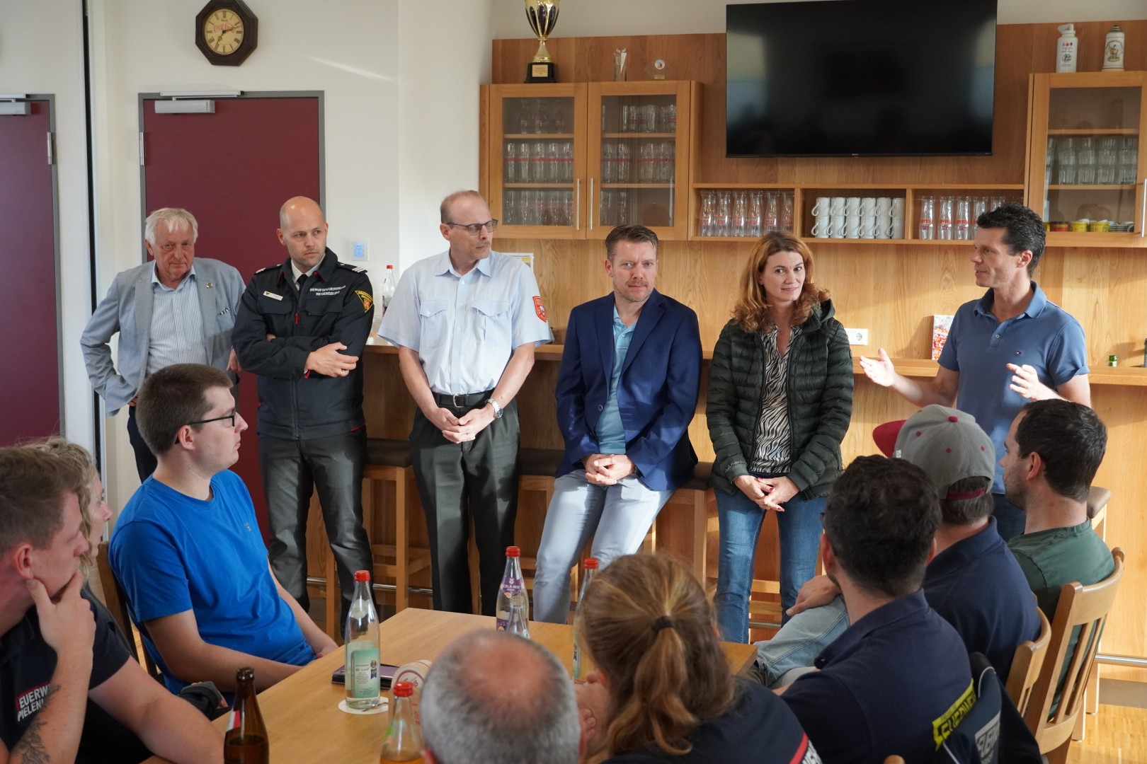 Neben Vertreterinnen und Vertretern der elf beteiligten Feuerwehren nahmen KBR Hans Bornschlegl, ÄLRD Dr. Markus Werkmann, Landrätin Tanja Schweiger sowie je ein Vertreter der Leitstelle und des ZRF an der Veranstaltung teil.