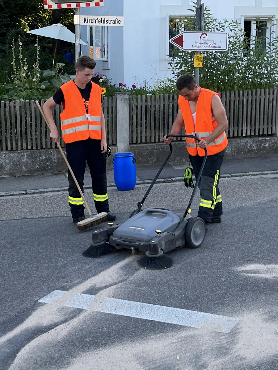 Nach einer ersten Erkundung durch unseren 1. Kommandanten und Einsatzleiter alarmierte dieser weitere Kräfte ins Gerätehaus. Hier wurde die Fahrzeuge besetzt und wir kümmerten uns um die Öl- / Dieselspur welche sich im Ortsbereich verteilt hatte. Durch den Bauhof Alteglofsheim ließen wir noch zusätzlich Ölwarnschilder aufstellen. Nach ca. 1 Stunde Arbeitszeit konnten wir die Straße im Ortsbereich wieder freigeben und in unser Gerätehaus einrücken.