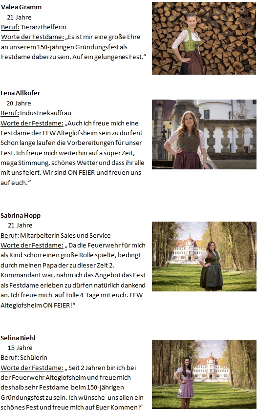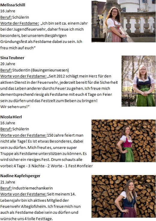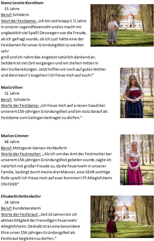 Großes Interesse konnten wir bei den Alteglofsheimer Mädels im Bezug auf unsere 150 jähriges Gründungsfest wecken. Neben unserer Festmutter Marion und Festbraut Elisabeth folgen uns 22 Festdamen und sechs Festkinder in der diesjährigen Fahnenweisaison. Wenn ihr mehr über unsere Festdamen erfahren wollt, und wo sie anzutreffen sind, dann folgt uns unter: Instagram