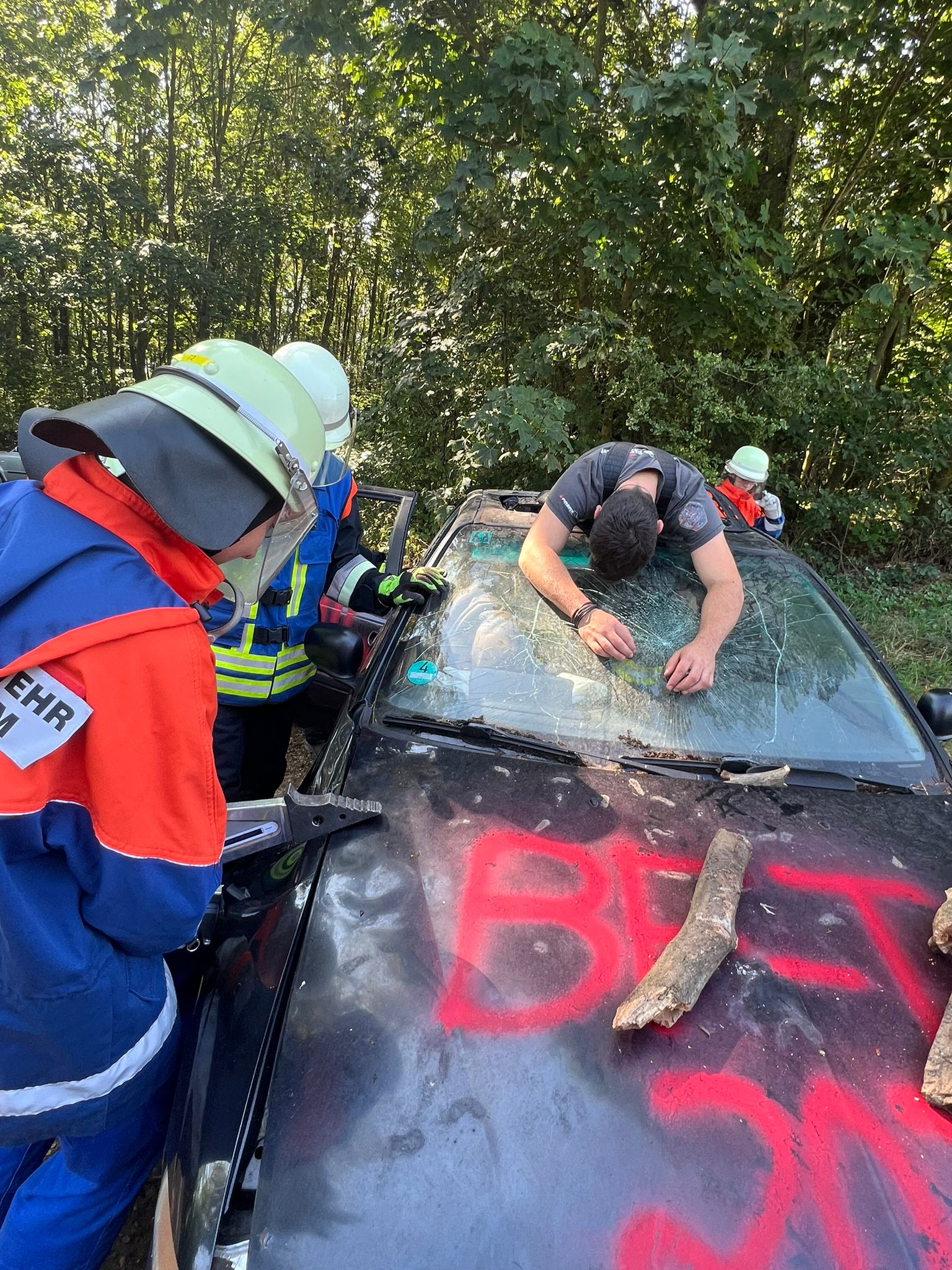 Gestärkt vom gemeinsamen Frühstück ließ der erste Einsatz nicht lange auf sich warten: Gegen 10:00 Uhr wurden sie von unserer Übungsleitstelle zu einer verschütteten Person gerufen. Nicht lange zurück am Gerätehaus wurden wir um 11:00 Uhr zu einem Verkehrsunfall mit mehreren eingeklemmten Personen alarmiert. Zurück am Feuerwehrhaus gab es für die Mädchen und Jungen Pizza zum Mittagessen, um genügend Kräfte für die noch anstehenden „Einsätze“ zu sammeln. Nach der kurzen Mittagspause lautete das nächsten Einsatzstichwort „Brand landwirtschaftliche Maschine“, welches rasch von unseren Jugendlichen abgearbeitet wurde. Gemeinsam mit der Jugendfeuerwehr der Feuerwehr Köfering wurden wir um 16:00 Uhr zu einem Brand eines landwirtschaftlichen Anwesens gerufen. Nach dem Abendessen ging es mit einem Gefahrguteinsatz weiter, der durch einen Betriebsunfall mit Ethanol verursacht wurde. Zum letzten Einsatz für den Abend fuhren wir zu einem Kellerbrand in einer Bäckerei, bei dem mehrere Personen vermisst wurden. Nach einer kurzen Nacht wurden die Jugendlichen durch die Alarmierung zu einer Person, die unter einer landwirtschaftlicher Maschine eingeklemmt war und gerettet werden musste. Nachdem gemeinsam das Feuerweehrhaus und die Fahrzeuge auf Vordermann gebracht haben, ließen wir uns das wohlverdiente Frühstück zum Ausklang des Berufsfeuerwehrtages gemeinsam schmecken.