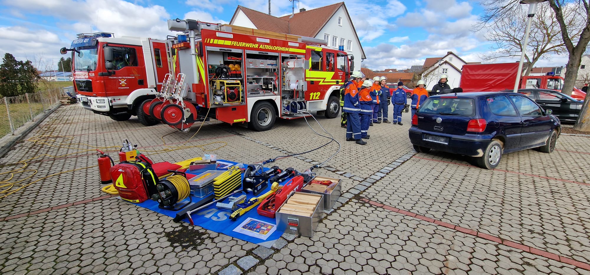 Am vergangenen Samstag waren wir zu Gast bei der Freiwilligen Feuerwehr Pfakofen. Im zuge der MTA (Modularen Truppmann Ausbildung) hielten wir zusammen mit den Kollegen aus Pfakofen den praktischen Teil der technischen Hilfeleistung. Angenommen wurde ein Verkehrsunfall mit eingeklemmter Person. Nach Aufbau des Ablagefelds und einer kurzen Einweisung in unsere Geräte konnte die Lehrgangsteilnehmer selbst mit Spreizer und Schere unter unserer Anweisung arbeiten und ihr Wissen aus der Theorie in die Tat umsetzen.