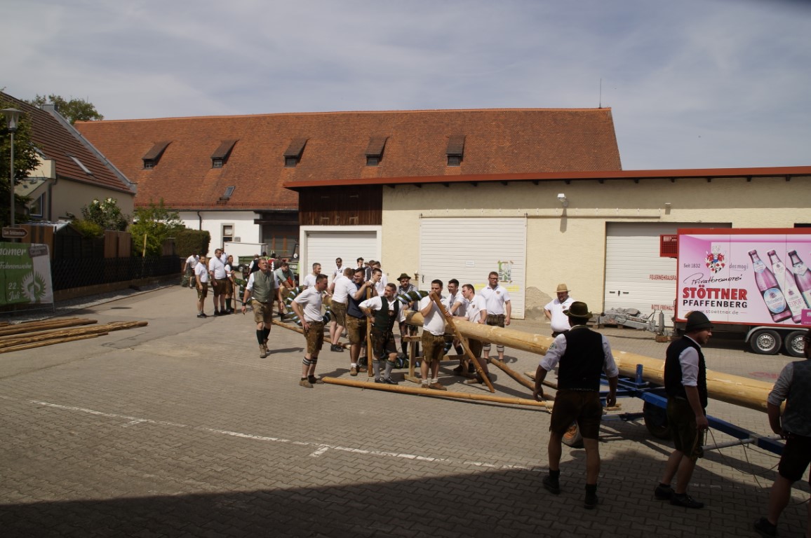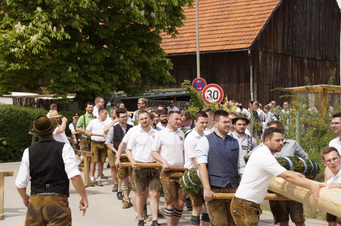 Der 34 Meter lange Baum, welcher von Pater Puthussery gestiftet wurde, steht weiterhin an unserem alten Gerätehaus mitten im Dorf.  Nachdem der Maibaum am Tag vorher gefällt, vorbereitet und geschmückt wurde, trugen ihn 49 Aufsteller zum Festplatz. Begleitet wurden sie dabei wie bei uns üblich von einer großen Schar Kinder, die teils auf dem Baum mitgenommen wurden. Anschließend wurde der Maibaum nur mit Muskelkraft aufgestellt. Musikalisch begleitet wurde das Fest von den Pfatterer Buam.