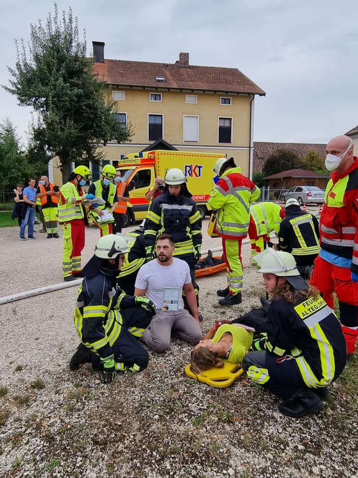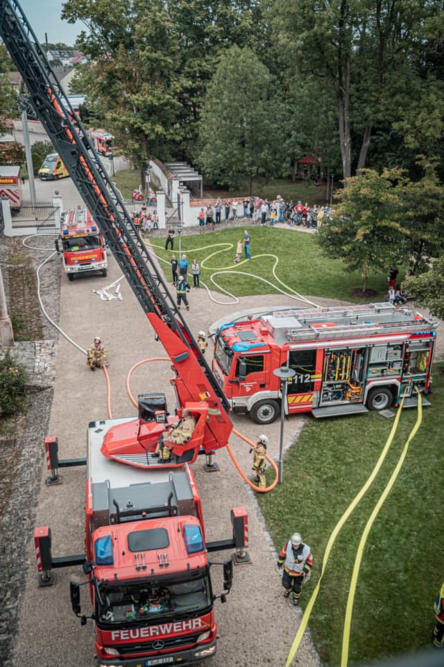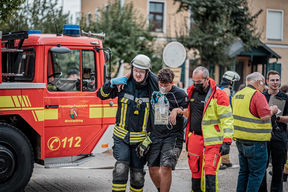 Des Weiteren war ein Großaufgebot des RKT Rettungsdienstes angefordert. Beim Eintreffen der ersten Einsatzkräfte war bereits eine starke Rauchentwicklung sowie Personen die an den Fenstern um Hilfe schrien sichtbar. Sofort wurde ein Innenangriff mit Atemschutzgeräteträgern sowie die Personenrettung über die Schiebleiter eingeleitet. Aufgrund der Größe des Objekts wurde die Einsatzstelle in die Abschnitte „Ost“, „West“ und „Wasserversorgung“ eingeteilt. Nach kurzer Zeit konnte von den Wenderohren der Drehleitern aus Mintraching, Neutraubling und Schierling eine gezielte Brandbekämpfung am Dach vorgenommen werden. Der große Wasserbedarf wurde über drei B-Leitungen, welche vom Dorfweiher wo das Wasser entnommen wurde und über lange Schlauchleitungen zum Übungsobjekt gepumpt wurde, sichergestellt. Durch die eingesetzten Atemschutzgeräteträger wurden 12 vermisste Personen, welche täuschend echt geschminkt waren aus dem Gebäude gerettet und dem Rettungsdienst übergeben. Die Koordination von medizinischer Seite wurde durch den Einsatzleitlkw des RKT´s gestemmt. Zusätzlich wurde durch am Festplatz ein Verletztensammelpunkt mit Hubschrauberlandeplätzen eingerichtet.
