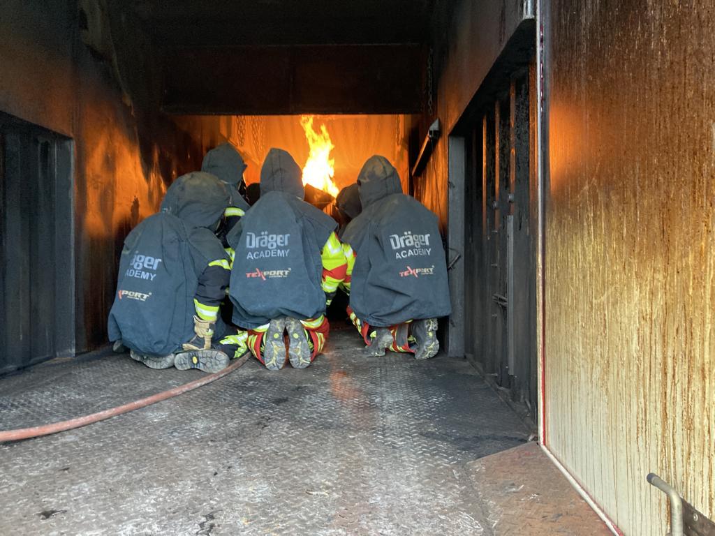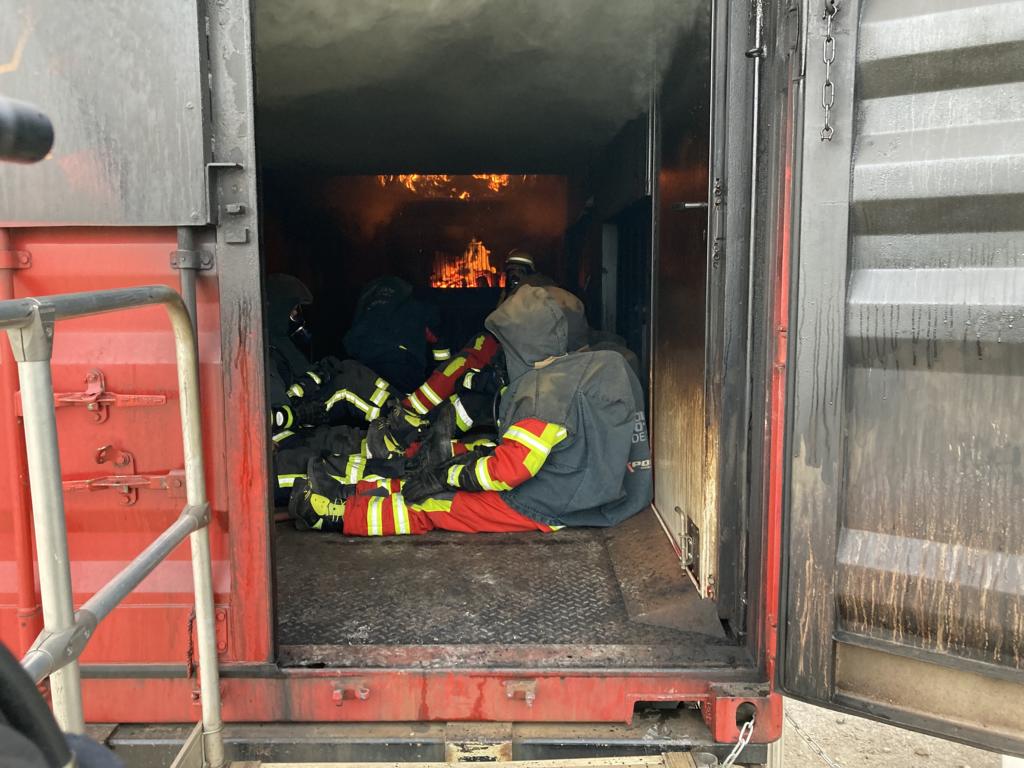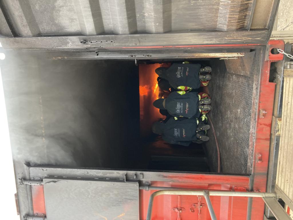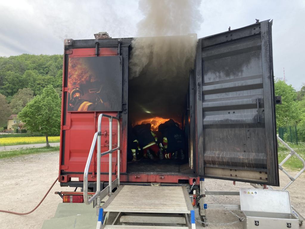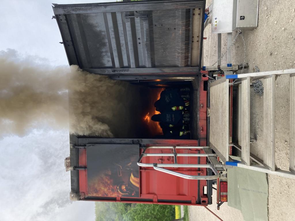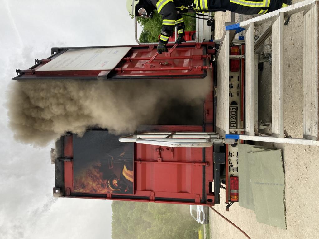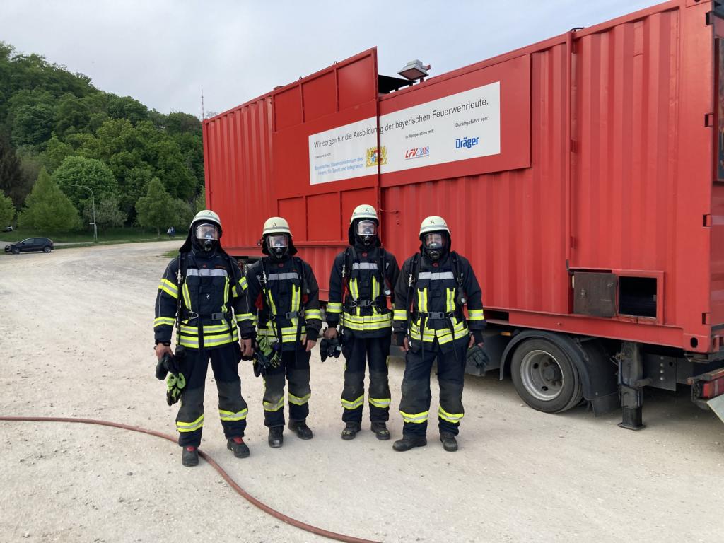 In diesen sollen die Teilnehmer verstehen, wie ein Brand verläuft, wie sich dieser entwickeln kann und wie sich die Atemschutzträger vor der Gefahr einer Rauchgasdurchzündung schützen können. Bevor es aber in den Übungscontainer ging erhielten die Teilnehmer in einer 90-minütigen Theorie das für die Praxis benötigte Fachwissen gelehrt. Im Anschluss darauf rüsteten sich die Träger mit Atemschutzgeräten aus und wurden in die Anlage eingewiesen. Befeuert wird der Container mit sieben Spannblatten. Diese stellen im Realeinsatz Möbel da. Nach entzünden im Container beobachteten die Teilnehmer zuerst die Rauschschicht und wie sich diese verändern. Durch unsere Wärmebildkamera konnte die Teilnehmer auch erkennen, wie die Temperatur in der Rauchschicht von Minuten zu Minute anstieg. Durch den Sicherungstrupp wurde der Container kurzzeitig verschlossen und wieder geöffnet um im inneren eine kontrollierte Rauchgasdurchzündung erzeugen zu können. Anschließend konnten die Teilnehmer probieren, wie sie mit der richtigen Strahlrohrtechnik eine bevorstehende Rauchgasdurchzündung verhindern können. Nachdem jeder Teilnehmer dies erfolgreich probiert hatte wurde der Container ein zweites Mal verschlossen. Jetzt wurde durch den Trainer eine große Menge Wasser in das Feuer abgegeben. Hier wurde den Teilnehmer demonstriert, dass auch unsere Schutzkleidung im innenangriff grenzen hat. Durch die Abgabe von viel Wasser entsteht Wasserdampf, der nur bis zu einer gewissen Menge durch unsere Schutzkleidung abgehalten wird. Nach Verlassen des Containers wurde die kontaminierte Schutzkleidung richtig abgelegt, ordnungsgemäß verpackt und zur weiteren Reinigung gebracht. Wir bedanken uns recht herzlich bei der Firma Dräger und dem LFV Bayern, die die Patenschaft für den Container übernehmen und unseren Atemschutzträger solch eine wichtige Ausbildung ermöglichen.