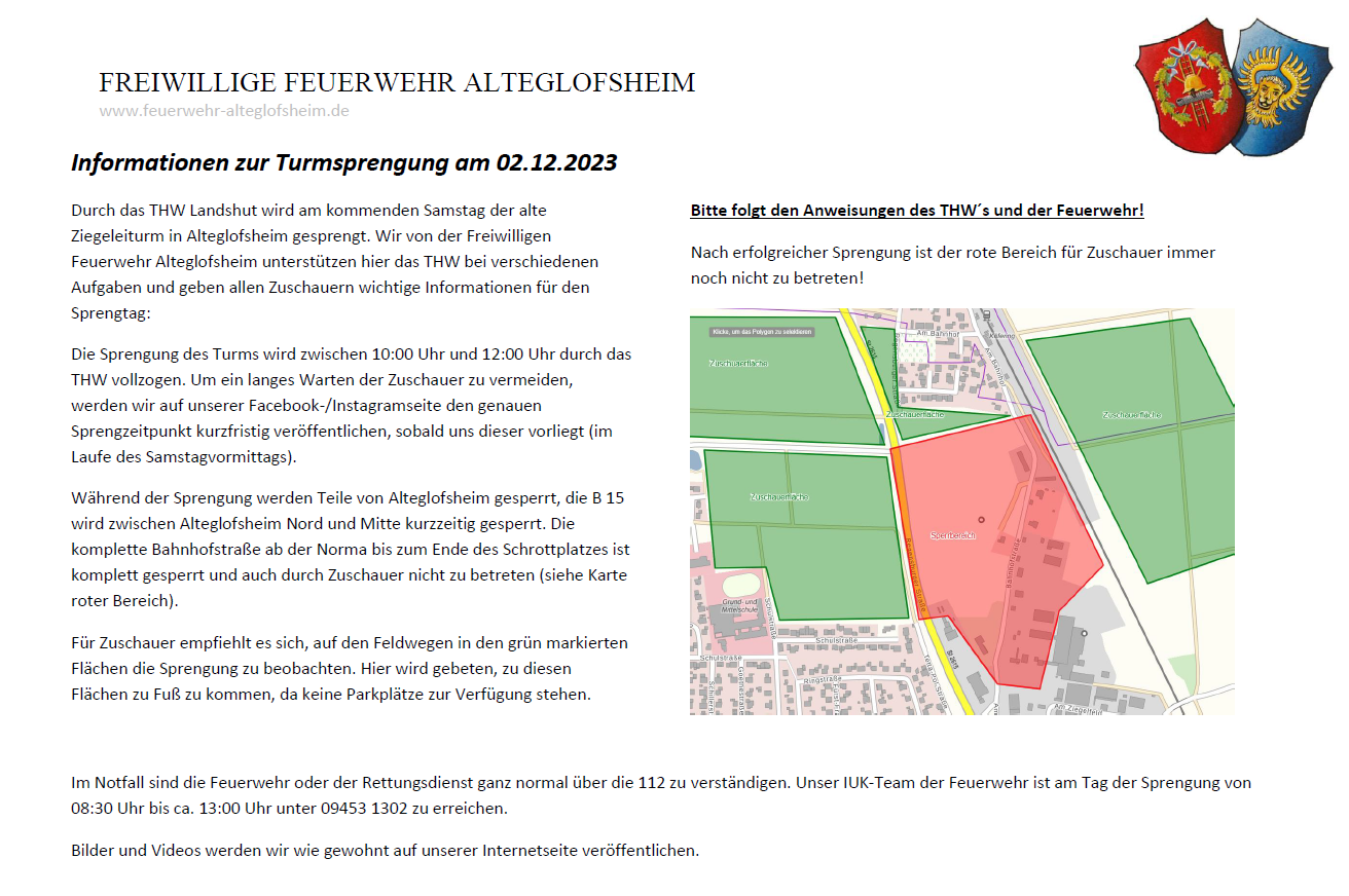 Am kommende Samstagvormittag wird der alte Ziegeleiturm in Alteglofsheim gesprengt. Anbei haben wir für alle Interessierten einige kurze Infos zusammengefasst: Link