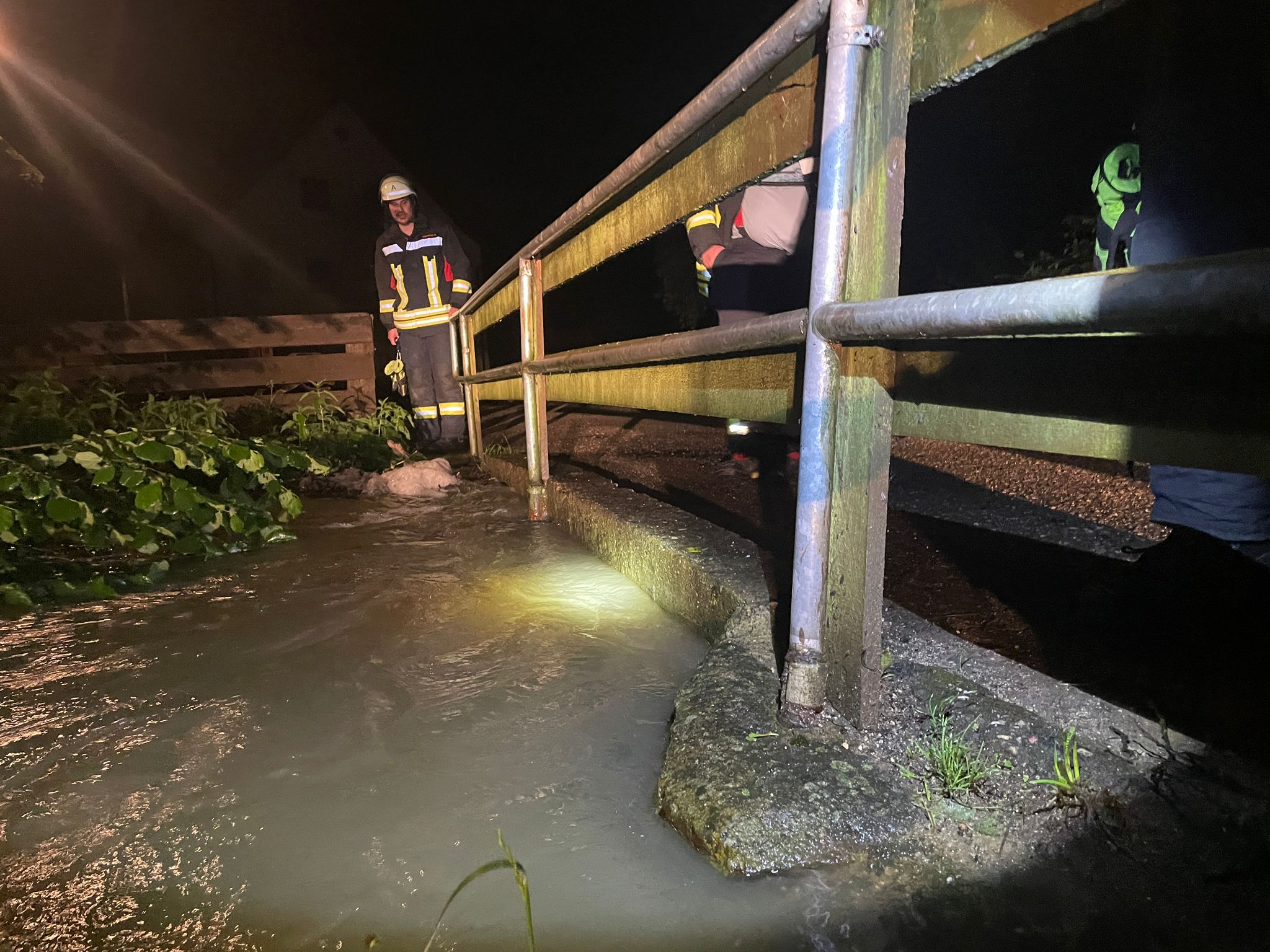 Nach unserer Erkundung an der Aumühle entschied sich der Einsatzleiter zur Sicherheit an der Pfatter Sandsäcke anbringen zu lassen. Dankenswerter stellte uns hier dier FF Thalmassing bereits gefüllte Sandsäcke zur Verfügung. Wir verteilten die Säcke vor Ort und konnten wieder Einrücken. Zur Sicherheit führten wir im Laufe der Nacht mehrere Kontrollfahrten durch.