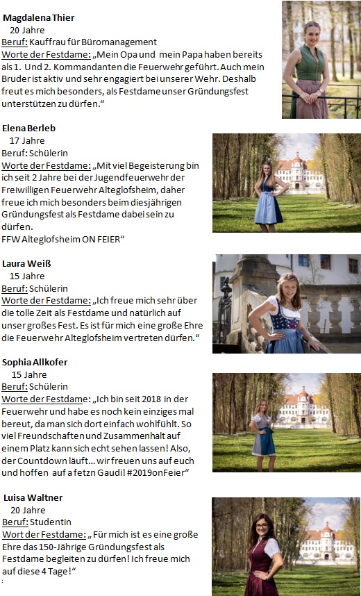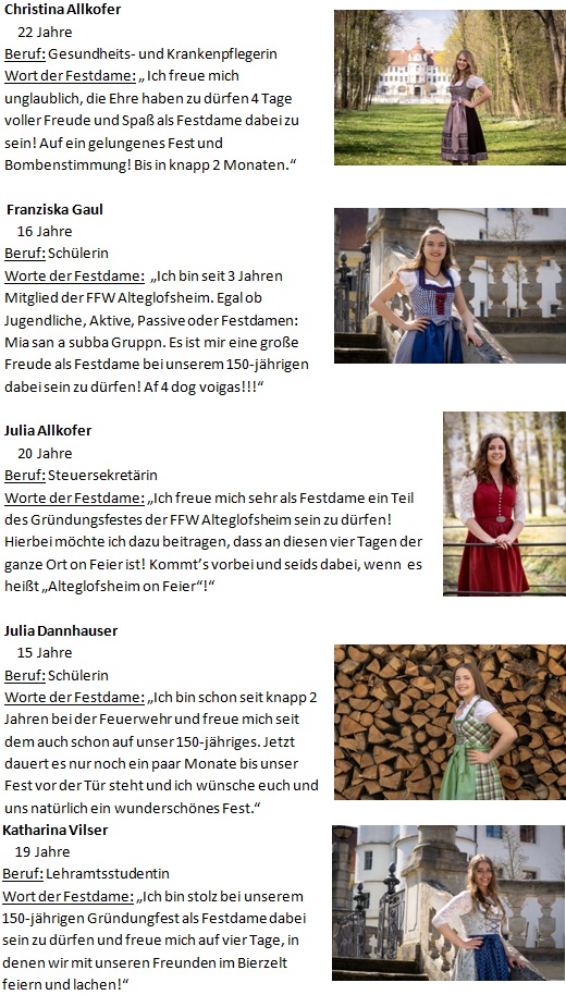Großes Interesse konnten wir bei den Alteglofsheimer Mädels im Bezug auf unsere 150 jähriges Gründungsfest wecken. Neben unserer Festmutter Marion und Festbraut Elisabeth folgen uns 22 Festdamen und sechs Festkinder in der diesjährigen Fahnenweisaison. Wenn ihr mehr über unsere Festdamen erfahren wollt, und wo sie anzutreffen sind, dann folgt uns unter: Instagram