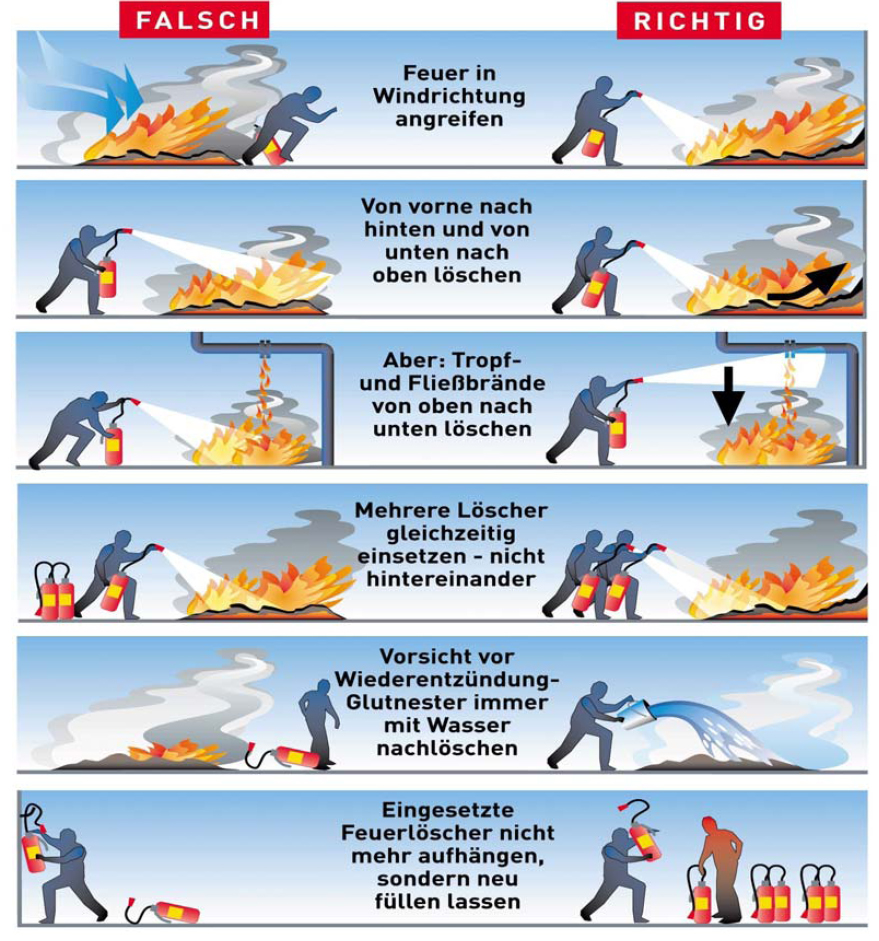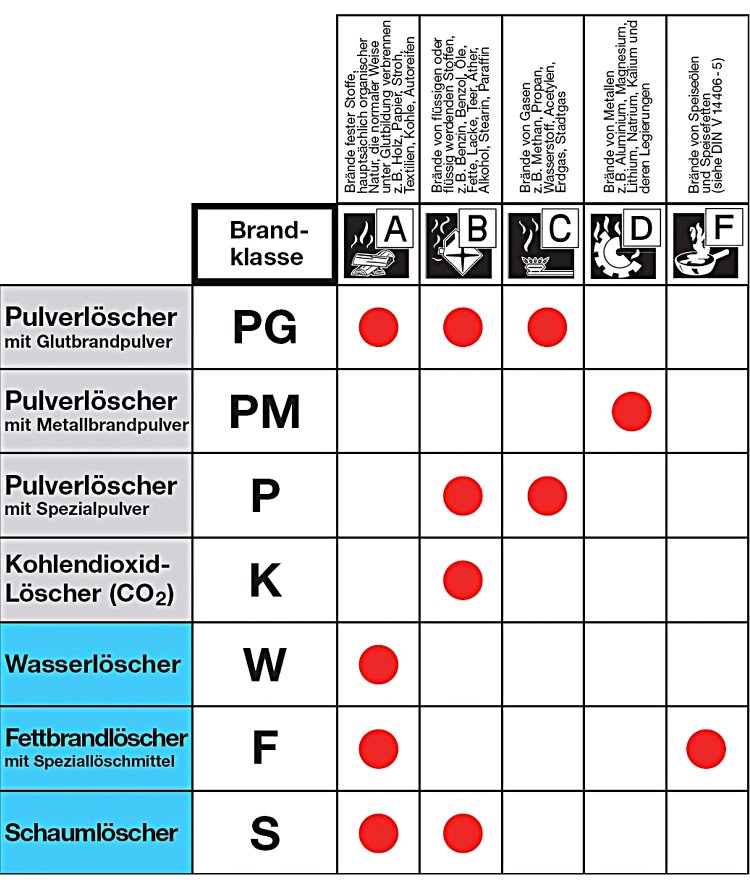 Bei der Bekämpfung eines Entstehungsbrandes ist es immer wichtig, den brennenden Stoff mit dem richtigen Löschmittel zu löschen. Hier eine kleine Übersichtstabelle: