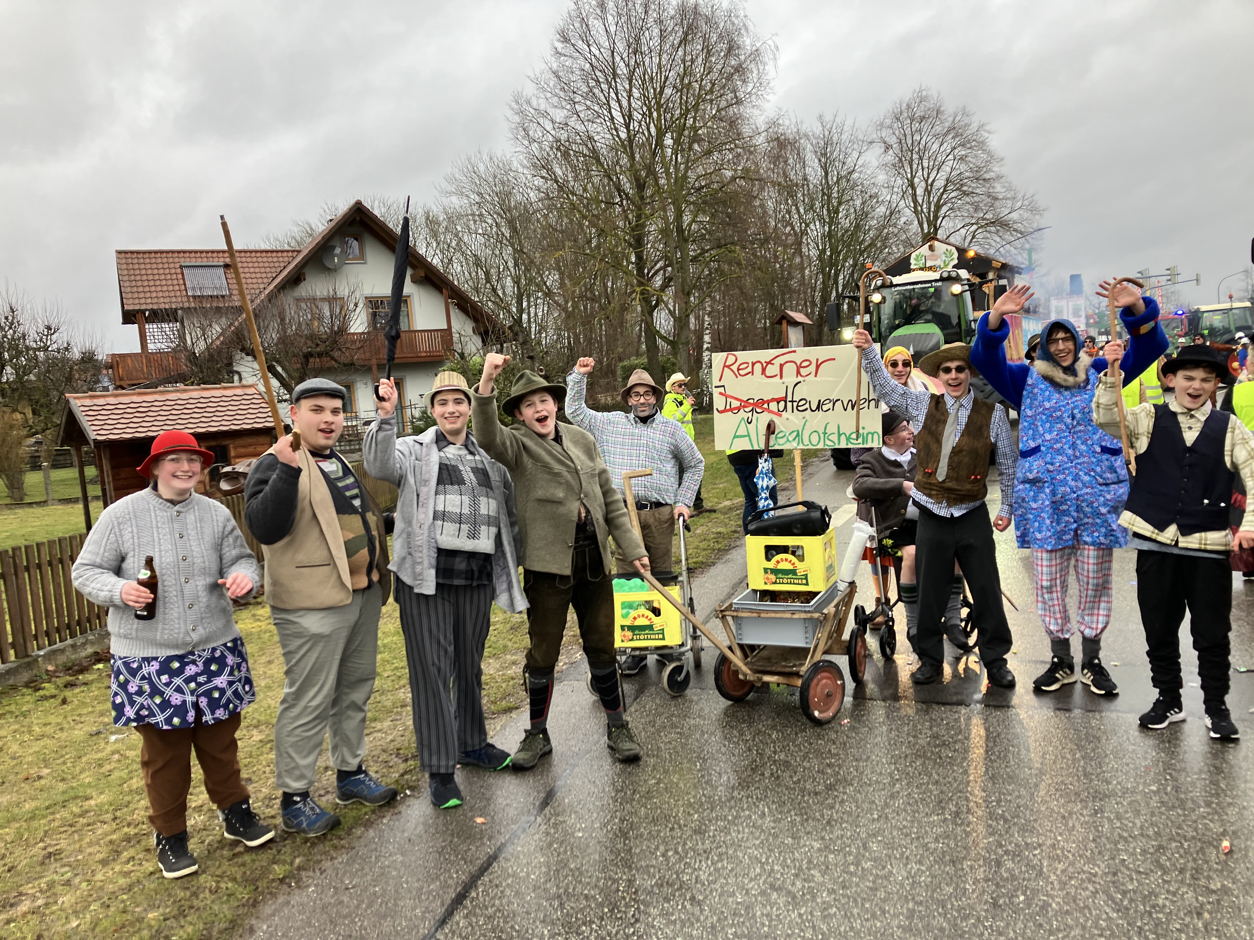 Mit 10 Jugendlichen beteiligten wir uns auch dieses Jahr wieder am Alteglofsheimer Fachingsumzug. Unter dem Motto Rentner - feuerwehr Alteglofsheim zogen wir mit einer Fußgruppe durch den Ort.