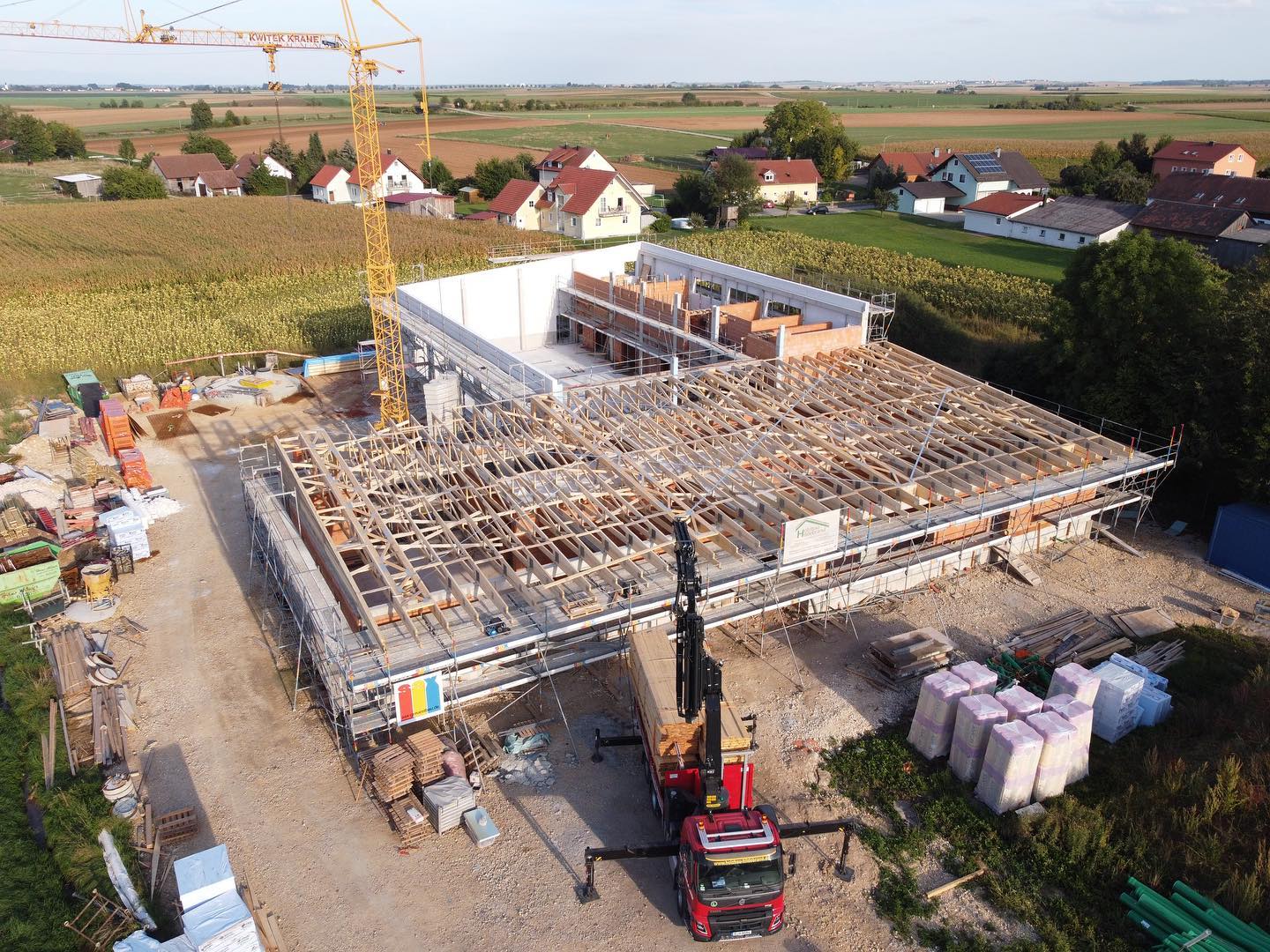 Bereits seit einigen Tagen ist auf unserer Baustelle ein neues Gewerk tätig geworden. Gerade wird damit Begonnen, den Dachstuhl für den Sozialtrakt zu errichten. Sobald diese Maßnahmen Abgeschlossen sind, beginnen die Arbeiten im Inneren.